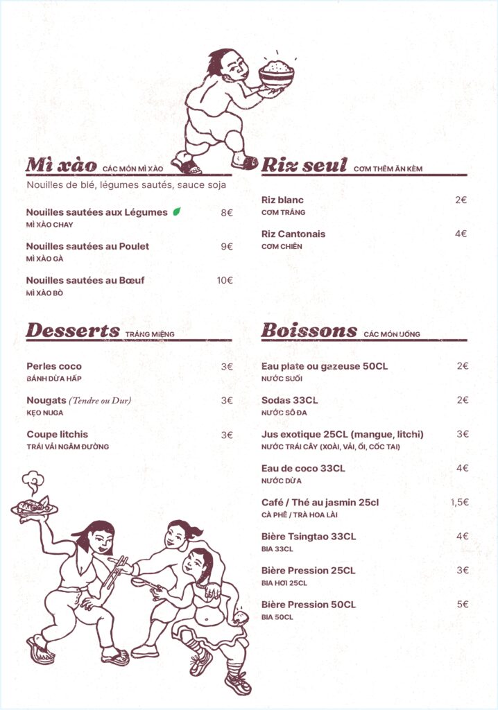 Alors appelle-nous cantine de quartier car chez nous tout est bon, fait maison, sans façons ni contrefaçons. Oui, tu trouveras dans ton assiette uniquement des recettes familiales de la famille Huynh : bo bun, nems, pho, banh mi et compagnie…